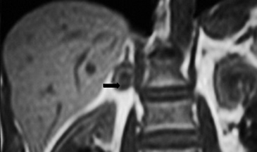 La RM es la modalidad de elección de este tipo de lesiones, puesto que demuestra la extensión intraespinal y las localizaciones secundarias hepáticas; su intensidad de señal es hipointensa en T1 y de alta señal en T2, generalmente heterogéneos por la presencia ya descrita de hemorragia y necrosis.