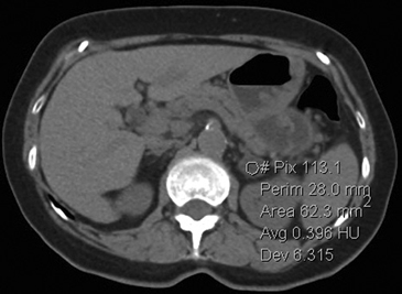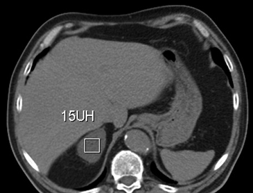 Figura 10. Adenoma suprarrenal derecho. Lesión suprarrenal derecha, cuya densidad es consistente con un adenoma típico. En la imagen se demuestra una adecuada medición de la densidad lesional, con una región de interés (ROI) que abarca al menos dos tercios de ésta.
