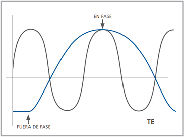 Figura 11. En el diagrama se grafican las distintas frecuencias de resonancia de los protones de agua (en azul) y grasa (en rojo). Dependiendo del tiempo de eco (TE) ambas señales pueden sumarse ("en fase") o restarse ("fuera de fase").