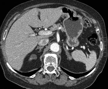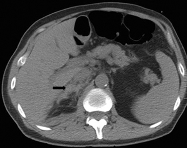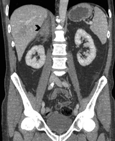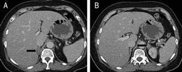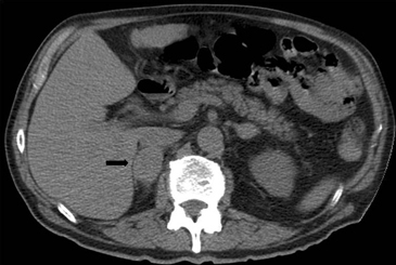 Figura 1. Glándula suprarrenal normal en tomografía computada. Cortes axiales de tomografía computada, donde se identifica la morfología normal de la glándula suprarrenal derecha (flecha) en fase no contrastada (a), y tras el uso de medio de contraste endovenoso (b).