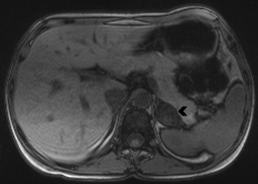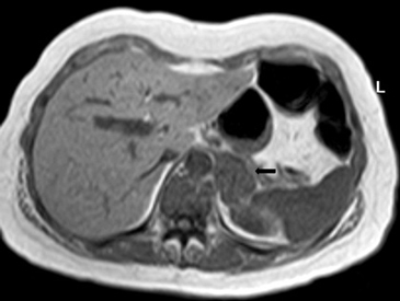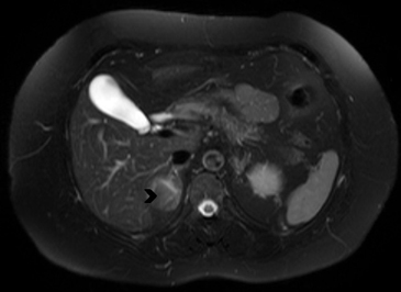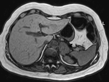 Figura 13. Glándula suprarrenal derecha normal. Corte axial de RM ponderada en T1 "fuera de fase", donde se demuestra un halo hipointenso en el margen de la glándula suprarrenal, el característico artefacto en "tinta china". Se ha estimado que existiría una relación lineal inversa entre la caída de señal y el contenido lipídico intracitoplasmático. Sin embargo la intensidad de la caída de señal también depende de la relación grasa-líquido dentro del voxel, puesto que en un voxel que sólo contenga grasa (como en el caso de los mielolipomas que sólo tienen grasa macroscópica) no se demostraría caída de señal en secuencia fuera de fase pues no existen protones de agua que cancelen la señal. Sin embargo hay que señalar que existen adenomas pobres en lípidos y estos muestran un comportamiento similar al de una lesión partes blandas de manera que hay escasa caída de señal en secuencia fuera de fase, por lo que no es posible su diferenciación con esta técnica.