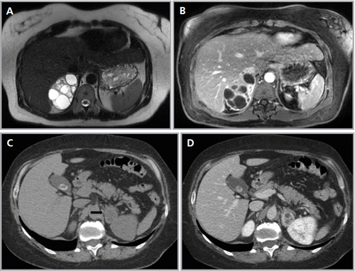 Figura 25. Feocromocitoma quístico. Cortes axiales de resonancia magnética (a) ponderado en T2 secuencia HASTE y (b) ponderado en T1 con saturación grasa y uso de contraste ev. Se identifica una lesión sólido-quística suprarrenal derecha, marcadamente hiperintensa en secuencias ponderadas en T2 y con significativo refuerzo de sus septos con el uso de contraste. Otro caso (c) y (d) cortes axiales de TC donde se demuestra una lesión suprarrenal izquierda (flecha), que también presenta áreas hipodensas centrales determinadas por focos de degeneración quística.