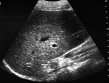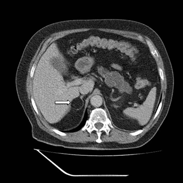 Figura 6. Lesión homogénea, de contornos bien delimitados (flecha) visualizada en tomografía computada sin contraste realizada en contexto de estudio de diseminación de cáncer mamario. A pesar de los caracteres morfológicos aparentemente benignos, se demostró que la lesión correspondía a una localización secundaria.