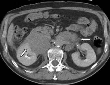 En TC, en la etapa aguda se manifiesta como una masa suprarrenal mal definida, espontáneamente densa (aproximadamente 50 a 60 UH en fase no contrastada) y que no presenta realce tras el uso de medio de contraste (Figura 35 a y b). En su evolución, la densidad y tamaño de la lesión disminuye en forma progresiva, y si no se produce reabsorción total del hematoma, puede observarse una lesión quística de paredes calcificadas o bien una glándula disminuida de tamaño y densamente calcificada.