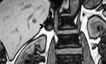 Figura 23. Carcinoma suprarrenal derecho. Corte axial de resonancia magnética ponderado en T2 con saturación grasa (a) en que se demuestra una masa suprarrenal derecha con áreas hiperintensas en su espesor probablemente determinadas por necrosis (flecha) y corte coronal en secuencia TRUFISP (b) en que se observa un trombo tumoral que expande el lumen de la vena cava inferior (cabeza de flecha).Puede también presentar invasión directa de otras estructuras vecinas, como riñón, páncreas, bazo y diafragma.