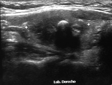 Paciente de sexo femenino, 61 años, con antecedentes de hipertensión arterial y dislipidemia. Estando asintomática, en control médico se pesquisa TSH disminuida por lo que fue derivada a endocrinología. Al examen físico destacaba a la palpación tiroidea un nódulo derecho, duro, móvil, no doloroso. El perfil hormonal confirma un hipertiroidismo subclínico (TSH 0,07 μUI/mL y T4L 1,33 ng/dL). Se solicita ecotomografía tiroidea que demuestra un bocio multinodular destacando un nódulo dominante en el lóbulo derecho, hipoecogénico, mal delimitado, asociado a gruesas calcificaciones, de 17,9 x 27,1 mm, con flujo al doppler color (Figura 1 y 2). Se realizó un cintigrama tiroideo que evidenció un nódulo hipercaptante en el lóbulo derecho con supresión parcial del resto del parénquima glandular; probablemente responsable del hipertiroidismo subclínico. Se solicita PAF del nódulo dominante cuyo resultado fue compatible con un carcinoma papilar tiroideo. La paciente se somete a tiroidectomía total, la cual se realizó sin incidentes. El resultado de la biopsia fue un carcinoma papilar, unifocal, variedad oncocítica tipo Warthin de 2,2 x 1,7 cm; el tumor no se extendía a tejidos peritiroideos, ni alcanzaba los bordes quirúrgicos, pero sí se observaban permeaciones vasculares tumorales (Figura 3). Recibió 100 mCi de yodo radioactivo (con TSH 90,12 μUI/mL, T4L 0,21 ng/dL, Tiroglobulina 2,8 ng/mL y anticuerpos antitiroglonbulina 1 UI/mL). La exploración sistémica evidenció una moderada a intensa captación en región anterior del cuello en relación al lecho tiroideo; el resto del cuerpo se apreciaba de distribución normal y no se evidenciaban imágenes sugerentes de metástasis extracervicales. La paciente inicia tratamiento con levotiroxina. En el control de los 6 meses la paciente se encontraba en buenas condiciones generales y asintomática, la ecografía cervical no mostraba evidencia de recidiva local, la tiroglobulina estaba indetectable (< 0,5 ng/mL) y los anticuerpos antitiroglobulina se mantenían negativos (1 UI/mL).