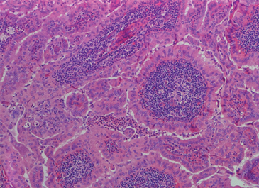 Figura 3. Se observan cortes transversales de estructuras papilares con infiltrado inflamatorio predominantemente linfocitario ocupando y ensanchando sus ejes fibrovasculares. El revestimiento epitelial es de células oncocíticas, cilíndricas, de citoplasma abundante, eosinófilo, granular. Núcleos ubicados en el tercio medio, grandes, sobrepuestos, claros, de contornos irregulares, con uno que otro pliegue. Discusión
