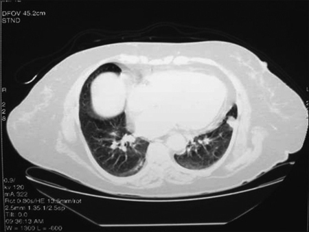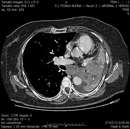 Mujer de 63 años, con antecedentes de tabaquismo crónico (30 paquete/año), depresión mayor y enfermedad pulmonar obstructiva crónica diagnosticada dos meses previo al ingreso. Consultó por 3 meses de tos con estrías de sangre, disnea progresiva y baja de peso de 9 kilos. Además refería poliuria, polidipsia y polifagia. Al momento del ingreso se presentó con apremio respiratorio, taquipnea y uso de musculatura accesoria. En el examen físico destacaba disminución del murmullo pulmonar en la base del hemicampo izquierdo y sibilancias bilaterales. Exámenes de laboratorio iniciales: glicemia 382 mg/dl, kalemia 2,9 mEq/L y alcalosis metabólica no compensada, resto de exámenes normales. La radiografía de tórax mostraba una atelectasia masiva del pulmón izquierdo. En el TC de tórax se observó una lesión pulmonar de aspecto tumoral hiliar izquierda con una gran atelectasia postobstructiva y derrame pleural ipsilateral (Figura 2). La biopsia por fibrobroncoscopía informó un cáncer pulmonar de células pequeñas. Durante la hospitalización se logró un buen control de los síntomas respiratorios; sin embargo, la paciente evolucionó con severas alteraciones hidroelectrolíticas e hiperglicemia resistente al manejo con dosis crecientes de insulina. Se planteó la presencia de un síndrome de Cushing paraneoplásico, por lo que se midió cortisol plasmático matinal: 67 μg/dL (VN < 25), Cortisol libre urinario 24 h = 21.411 μg/24 h (VN = 9-110), ACTH = 100 pg/ml (20-60).