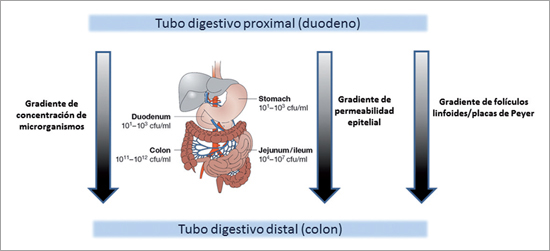 La distribución de la MI a lo largo del tubo digestivo no es homogénea sino que sigue una gradiente próximo-distal; las concentraciones de microrganismos, bajas en el duodeno, aumentan paulatinamente en el yeyuno y el íleo hasta alcanzar sus máximos en el colon (Figura 2). Paralelamente, existe también una gradiente de permeabilidad epitelial (un componente esencial de la función intestinal de barrera): el epitelio duodenal es muy permeable lo que contribuye al intercambio rápido de agua y electrolitos entre lumen y compartimento sistémico que ocurre durante el periodo post-prandial para restablecer la iso-osmolaridad del contenido luminal al plasma6. Sin embargo, esta permeabilidad epitelial disminuye progresivamente en el yeyuno e íleo (lo que significa que se incrementa la función intestinal de barrera) y llega a su mínimo en el colón, lo que le permite al epitelio colónico hacer frente a la alta densidad de microrganismos presentes a este nivel (Figura 2). Finalmente, existe también en el tubo digestivo una gradiente de inmunidad: la densidad y tamaño de los folículos linfoides y de las placas de Peyer, que agregan gran parte de las células inmunes presentes en la mucosa, aumentan desde el intestino proximal hasta el colon (Figura 2)6. La homeostasia del ecosistema digestivo está determinada por el equilibrio harmonioso entre estos tres componentes: microbiota, permeabilidad intestinal e inmunidad local. Cualquier factor o evento que afecte uno de estos componentes repercute sobre los demás e impacta negativamente sobre el organismo entero. Un gran número de enfermedades del sistema digestivo (diarrea, EICI, síndrome de intestino irritable), del sistema inmune (alergia, diabetes de tipo 1, esclerosis múltiple), del sistema nervioso central (autismo, esquizofrenia) o metabólicas (obesidad y DM2) están asociadas con alteraciones de la MI, de la función intestinal de barrera y de inmunidad local digestiva, aun si no se sabe con certeza si dichos cambios son causas o consecuencias de estas patologías (Figura 3). El concepto de prebiótico y probiótico ha sido desarrollado en el marco de la MI; ambos compuestos pueden ser considerados como herramientas nutricionales de interés para restablecer el equilibrio de la MI en los individuos cuya enfermedad está asociada con alteraciones de esta7.