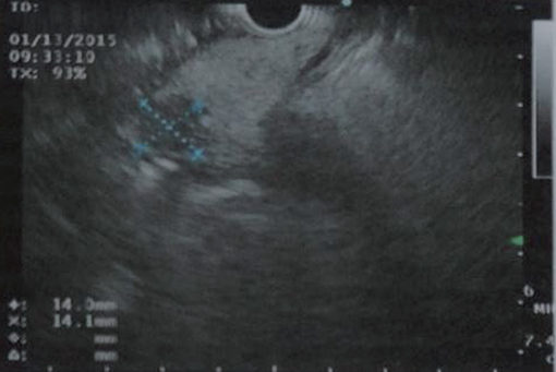 Figura 1. Endosonografía de páncreas que muestra imagen ovalada e hipodensa de lesión de 11 x 9,4 mm en cabeza de páncreas