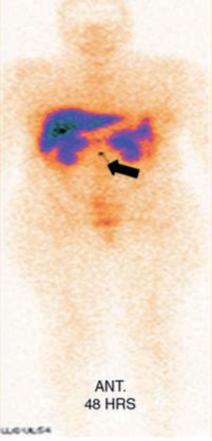 Figura 2. Octreoscan foco de captación en cabeza de páncreas, positivo para receptores de somatostatina. Discusión