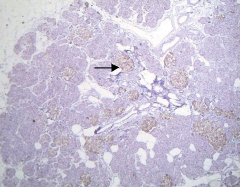Se le realizó cirugía de Whipple extirpándose masas de la cabeza de páncreas que fue informada como tejido pancreático endocrino aumentado levemente de tamaño y número, con células de citoplasma amplio y núcleos levemente irregulares, células neuroendocrinas aisladas y en grupos, entremezclándose con los acinos y en la periferia de los conductos formando unidades ductolobulillares, compatible con nesidioblastosis difusa (Figura 3).