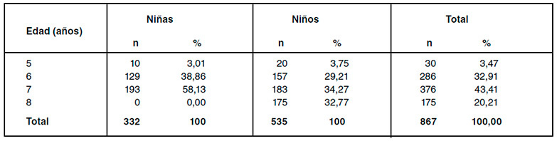 Un total de 3.010 escolares aceptaron participar y fueron examinados. El análisis de los sPP se realizó en 867 alumnos (535 hombres y 332 mujeres), correspondientes a la subpoblación que se encontraba en riesgo de presentar signos de PP, constituida por los alumnos varones menores de 9 años y mujeres menores de 8 años.