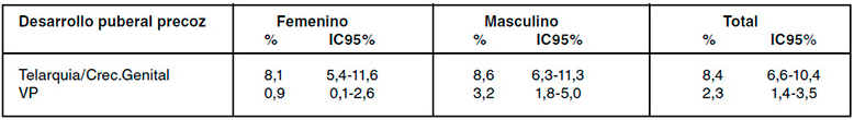 La prevalencia de tejido mamario y vello pubiano en niñas menores de 8 años fue de 8,13% y 0,9% respectivamente. En varones menores de 9 años la prevalencia de crecimiento genital y vello pubiano fue de 8,55% y 3,16% respectivamente (Tabla 3).