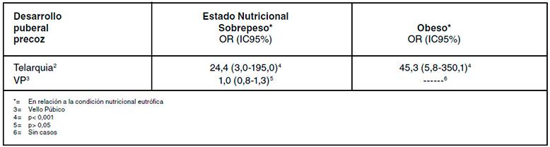 Se realizó un análisis de regresión logística controlado por edad que demostró que las niñas con sobrepeso y obesidad tienen mayor riesgo de presentar telarquia precoz con un OR de 25,5 (IC 95% 3,2-203,0) y de 46,93 (IC 95% 6,1-361,4) respectivamente. La presencia de vello pubiano no presenta asociación con la mal nutrición por exceso (Tabla 4).