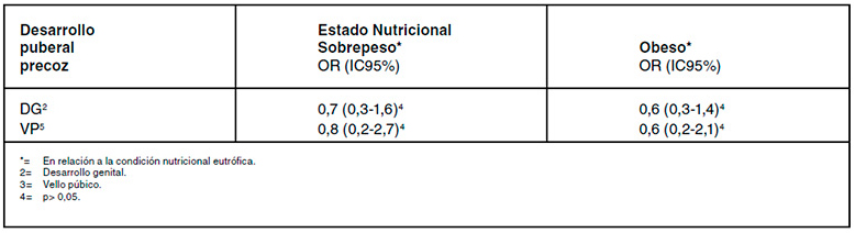 Esta asociación de sPP con estado nutritivo no se observó en sexo masculino. El análisis de regresión logística controlando por la edad realizado en varones demuestra que la mal nutrición por exceso no presenta en ninguna de sus categorías un mayor riesgo de presentar crecimiento genital o vello púbico antes de los 9 años (Tabla 5).
