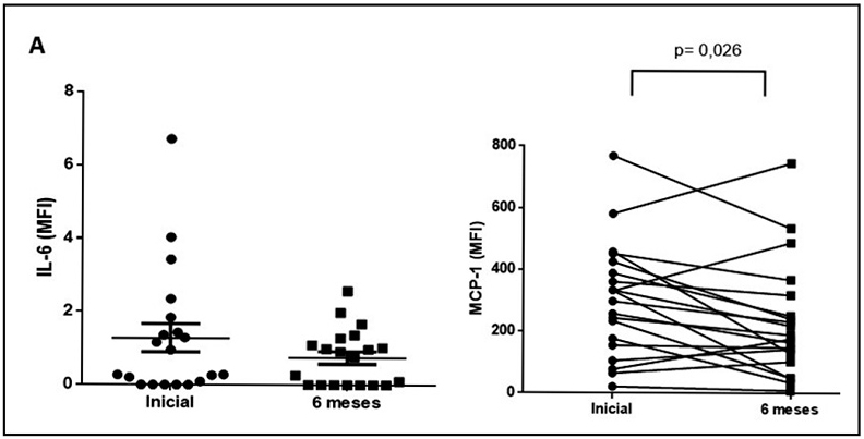 Dado que el ejercicio físico es un importante modulador de citoquinas y quimiocinas, se determinaron marcadores inflamatorios, antes y después de los 6 meses de adherencia al programa. Se encontró que, comparado con el estado basal, el nivel de proteína quimiotáctica de monocitos soluble (MCP-1) disminuía significativamente (P<0.05), mientras que no se observó una variación estadísticamente significativa en los niveles de Il-6 (Figura 2).
