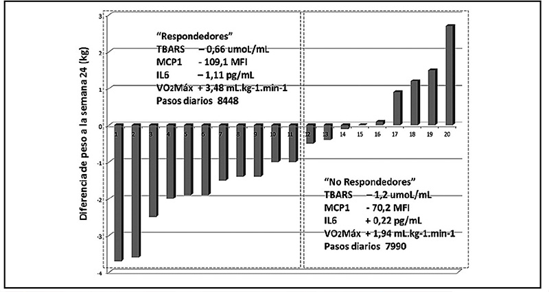 El ejercicio mejora el rendimiento y los parámetros bioquímicos en promedio, sin embargo, este estudio mostró una variabilidad interindividual. Cuando se examinó el cambio de peso en la semana 24, los participantes pudieron clasificarse en dos grupos (respondedores y no respondedores) en función de su cambio de peso calculado, según lo descrito por King y col4. Los pacientes “no respondedores” (n= 9) disminuyeron ≤ 1 kg o aumentaron de peso en comparación con los participantes restantes (“respondedores”, n= 11) que disminuyeron ≥1 kg. Comparando ambos grupos, aparecieron respuestas similares, con la excepción del grupo de respondedores que muestra una mayor disminución tanto en MCP-1 como en TBARS y un mayor aumento en VO2max (Figura 4).