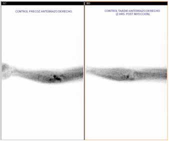 Figura 1: Cintigrama SESTAMIBI® implantes paratiroides de antebrazo. Exámenes preoperatorios: calcemia 8.6 mg/dL, fosfatemia 7.3 mg/dL, fosfatasas alcalinas 1115 UI/L (VN <100), iPTH 3509 pg/ml, bicarbonato plasmático 20.8 mEq/L y kalemia 4.8 mEq/L.