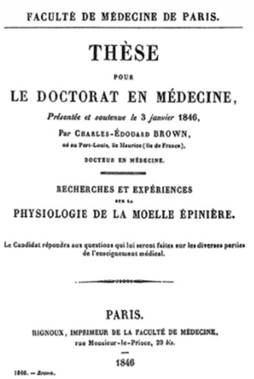 A la edad de 21 años, B-S daba claros signos de una inteligencia notable y aspiraba a ser escritor, de modo que su madre decidió llevarlo a París para que desarrollara sus talentos. En París, el consejo experto del poeta y bibliófilo Charles Nodier disuadió a B-S de iniciar una carrera literaria y decidió en cambio, estudiar Medicina. Su madre regentó una pensión estudiantil, pero falleció inesperadamente en 1842 a los 54 años, antes que B-S se recibiera de médico. Este agregó el apellido materno al paterno después de la muerte de su madre como homenaje póstumo a su memoria. Desde temprano B-S se interesó en la investigación y ya en 1846 publicó su tesis doctoral4 (Figura 1), en la cual sentó las bases para la descripción del síndrome que lleva su nombre, que corresponde a las consecuencias clínicas de la hemisección de la médula espinal. La curiosidad científica insaciable de B-S se alimentaba del método experimental, lo que lo convirtió en gran enemigo de los anti-viviseccionistas, los que objetaban el uso de animales en protocolos experimentales, ya que éstos sufrían todo tipo de procedimientos dolorosos, porque no se conocía la anestesia aún.