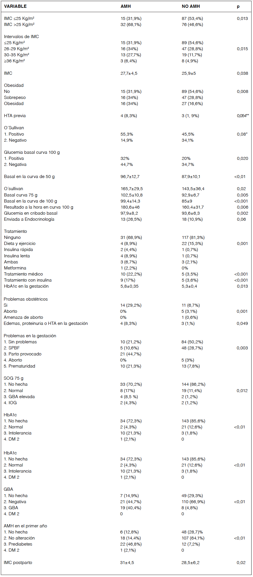 el desarrollo de AMH son la glucemia basal en el screening, la existencia de obesidad
