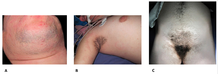 Figura 1: A) Acné y vello en mentón. B) Vello axilar y telarquia Tanner 1. C) Vello púbico y abdominal que evidencia el hirsutismo descrito.