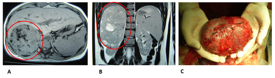 Figura 2: A) TC de abdomen (corte transversal): se observa masa suprarrenal derecha sólida, heterogénea, con sectores hipodensos y calcificaciones con bordes bien definidos, de 16x10x10 cm (círculo rojo). B) RM de abdomen (corte sagital): se observa la misma tumoración sólida (ovalo rojo) con realce inhomogéneo, contornos bien delimitados, algunas áreas sugestivas de necrosis. C) Pieza de resección: adrenalectomía con superficie externa lisa, completamente encapsulada.