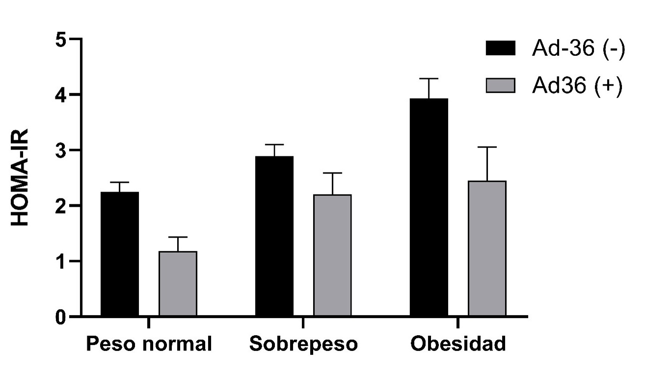 No se observaron diferencias significativas entre los grupos seropositivos y seronegativos en los parámetros bioquímicos del perfil lipídico y glicemia (p>0,05). Interesantemente, la RI fue significativamente menos frecuente en el grupo seropositivo contra Ad-36 (p=0,029), dado que en este grupo con infección previa (Ad-36 (+)) no se reportaron sujetos con RI. Consecuentemente, insulina (p= 0,003) y HOMA-IR (0,001) fueron significativamente menores en el grupo seropositivo. En la figura 1 se puede observar que la tendencia de menores valores del índice de resistencia insulínica HOMA-IR en sujetos Ad-36 (+) se mantienen independientemente del estado nutricional.