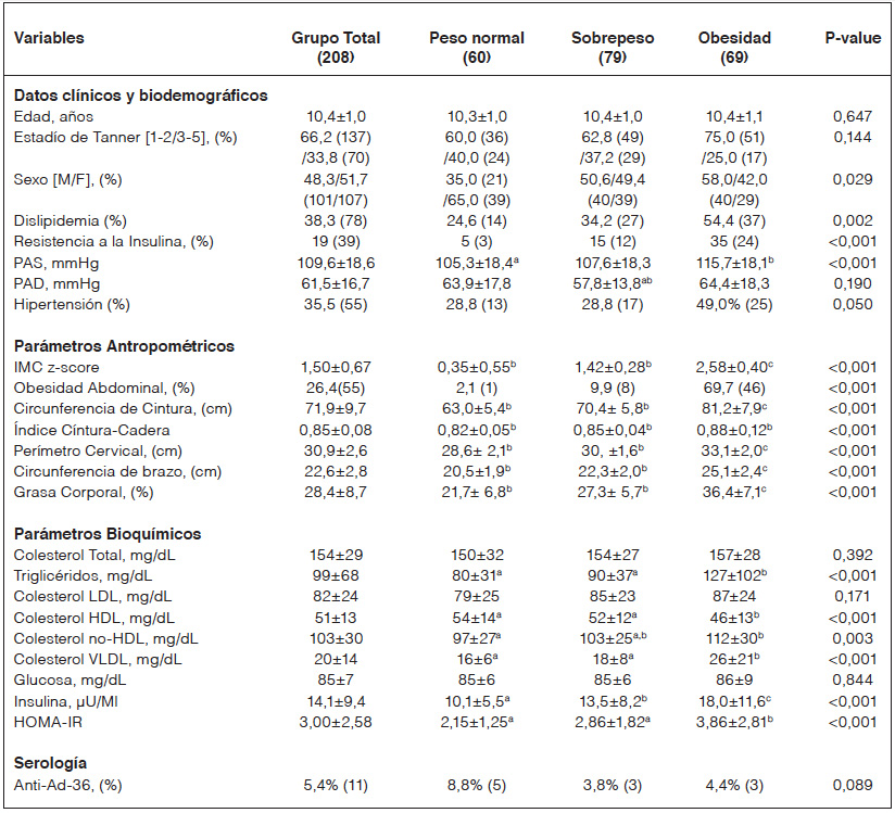 El número de individuos se indica entre paréntesis. Los datos categóricos se presentan como porcentaje y fueron comparados mediante la prueba de chi-cuadrado. Las variables continuas se muestran como media ± desviación estándar y fueron comparadas mediante ANOVA seguido del método de Tukey o Kruskal-Wallis seguido del método de Dunn para variables paramétricas y no paramétricas, respectivamente. Los niños fueron agrupados según su desarrollo físico en etapa Tanner 1-2 o 3-5. PAS: presión arterial sistólica, PAD: presión arterial diastólica, IMC: índice de masa corporal, LDL: lipoproteína de baja densidad, HDL: lipoproteína de alta densidad, VLDL: lipoproteína de muy baja densidad, HOMA-IR: índice de resistencia a la insulina según el modelo de evaluación homeostática, Anti-Ad-36: serología positiva contra adenovirus 36 a, b, c: Diferentes letras en la misma línea representan diferencias significativas.
