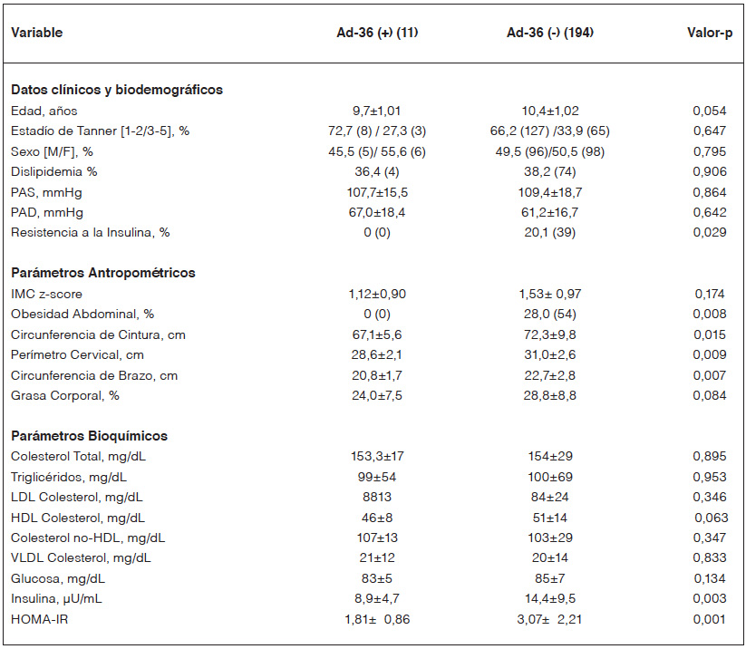 Muestras de sangre en ayuno de 10 a 12 horas fueron obtenidas mediante punción venosa las cuales fueron utilizadas para realizar las determinaciones bioquímicas y seropositividad contra el Ad-36. La concentración plasmática de glucosa, colesterol total (CT) y triglicéridos (TG) fue determinada mediante métodos enzimático-colorimétricos. La concentración de colesterol VLDL (cVLDL) fue calculada como la quinta parte de la concentración de triglicéridos (TG/5), la concentración de cLDL fue calculada mediante la Formula de Friedewald y la concentración de colesterol no-HDL (c-noHDL) fue calculada como la diferencia entre el colesterol total y cHDL. La insulina fue determinada por quimioluminiscencia. Los análisis bioquímicos y hormonales fueron realizados en los instrumentos Roche- Cobas 331 y 411 (Roche Diagnostics, Basilea, Suiza). Los valores de glucosa e insulina fueron usados para el cálculo del índice HOMA-IR (Homeostatic model assessment-insulin resistance). Para definir la presencia de resistencia a la insulina (RI) fue empleado el HOMA-IR utilizando el criterio para población pediátrica chilena propuesto por Barja et.al13, considerando el estadío de Tanner y el sexo de los individuos. La presencia de dislipidemia de acuerdo a criterios para población pediátrica fue definida como previamente descrito en trabajo de nuestro grupo14.