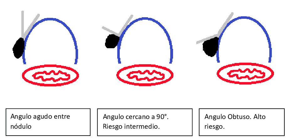 En la figura 1 se muestra a modo esquema como valorar el posible compromiso traqueal según el ángulo formado por el nódulo y la tráquea5.