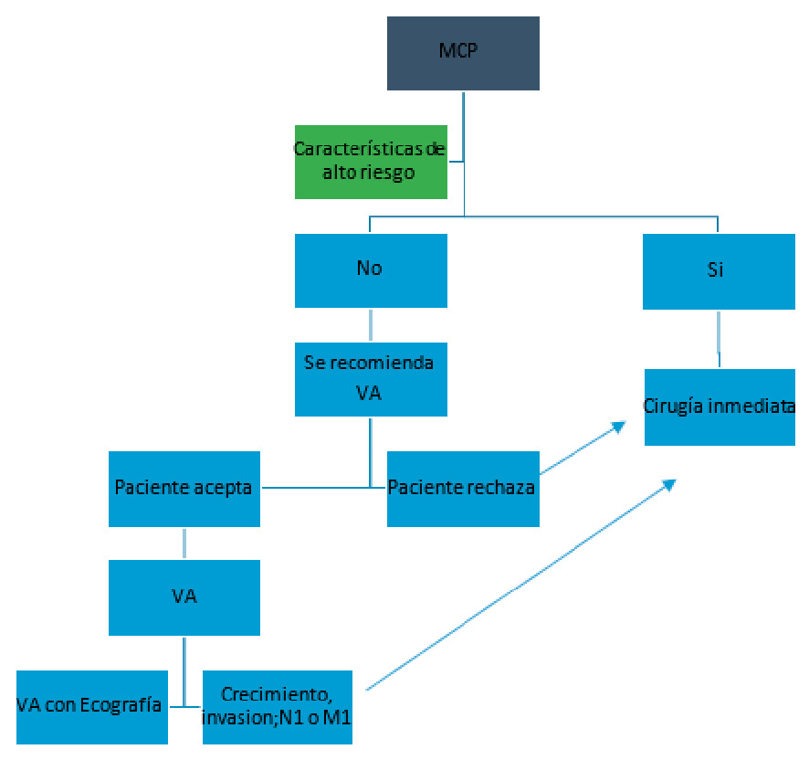 Será fundamental buscar elementos clínicos y paraclínicos que permitan tomar una decisión práctica, con el fin de determinar qué pacientes con MCP podrán entrar en un protocolo de VA. Esto no implica bajo ningún concepto influir negativamente en la sobrevida de los pacientes sino todo lo contrario, disminuyendo los riesgos de la cirugía en MCP. Es conocido por estudios epidemiológicos que en su enorme mayoría no progresaron bajo seguimiento, y solo un 10 a 15% lo hará en los primeros 5 años8,9.