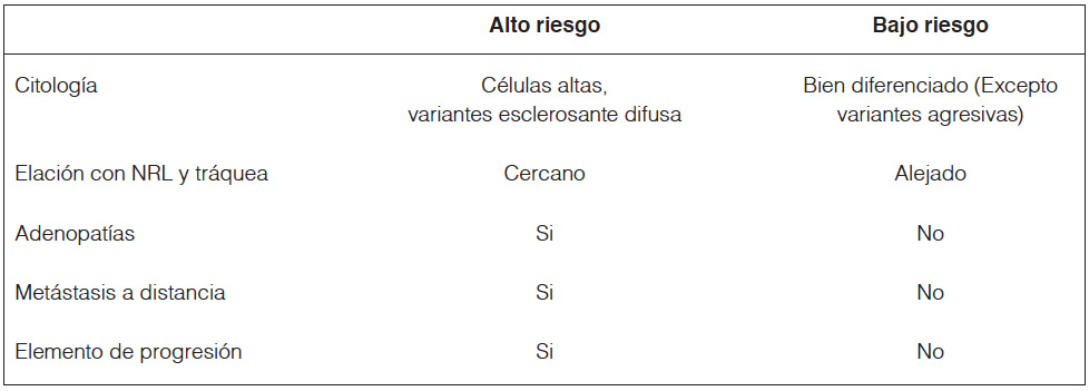 Otros factores importantes en la toma de decisiones son: edad menor de 40 años (presentan más riesgo de crecimiento) antecedentes personales de irradiación en cabeza y/o cuello, antecedentes familiares de cáncer papilar tiroideo.