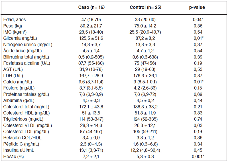 Datos expresados como media ± DS para datos paramétricos y como mediana y rango para datos no paramétricos. IMC: índice de masa corporal; GOT (transaminasa glutámica oxalacética) o AST (aspartato aminotransferasa); LDH: Deshidrogenasa láctica; HDL: colesterol de lipoproteínas de alta densidad; VLDL: colesterol de lipoproteína de muy baja densidad; LDL: colesterol de lipoproteína de baja densidad; HbA1c: Hemoglobina glicosilada.
