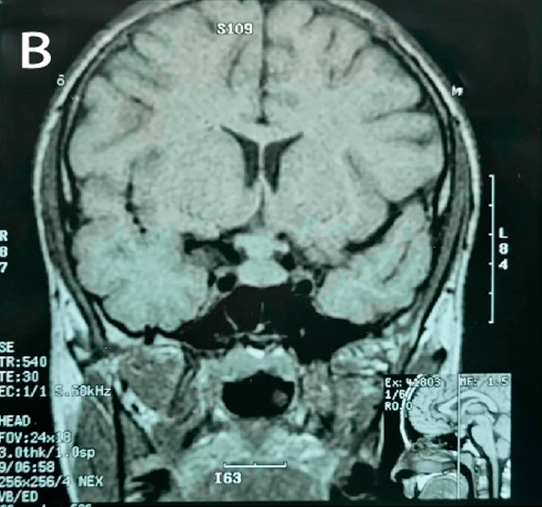 Se realiza diagnóstico de deficiencia de arginina-vasopresina central y se inicia desmopresina intranasal a demanda. Se realiza una RMN con enfoque selar, que reporta una lesión hipofisaria que compromete glándula y tallo hipofisario (Figura 1).
