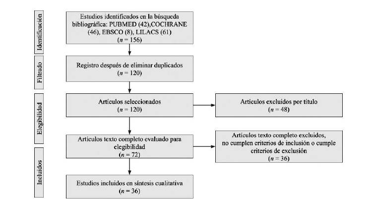 La búsqueda en las bases de datos dio un total de 156 referencias, 42 fueron obtenidas de PubMed, 45 de Cochrane, 8 de EBSCO y 61 de LILACS. Un revisor independiente aplicó los criterios de selección a los resultados de búsqueda. 36 artículos se excluyeron por estar duplicados, 48 por título y 36 por no cumplir criterios de inclusión o cumplir criterios de exclusión. Se obtuvieron 36 artículos, los cuales se revisaron de manera completa para el análisis. El proceso de selección de referencias se expone en la figura 1.
