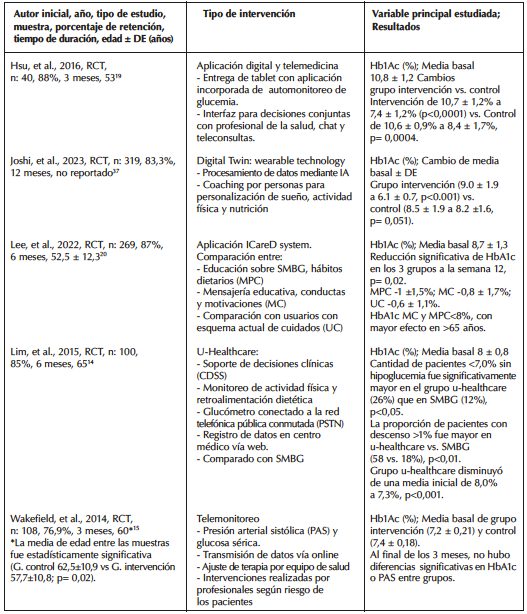 (reducción de hemoglobina glicosilada <1%) o no concluyentes. Objetivo: Revisar los métodos y resultados de distintas intervenciones tecnológicas aplicadas